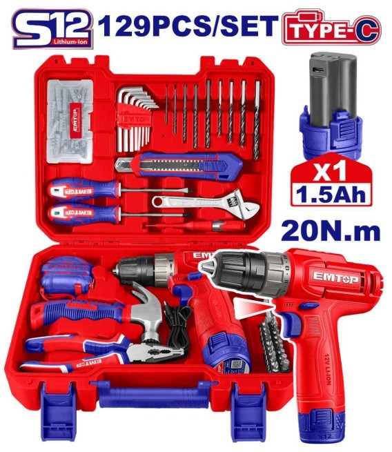 JOGO DE FERRAMENTAS C/FURADEIRA 12V 129 PCS - EMTOP