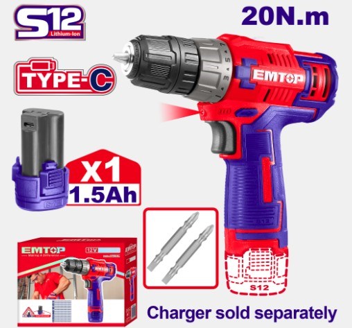 PARAFUSADEIRA FURADEIRA C/1 BATERIA 0.8-10MM 12V 20N-M - EMTOP